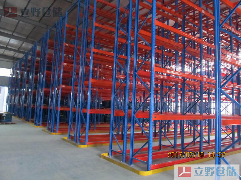 貨架系統(tǒng)主體為橫梁式貨架系統(tǒng),區(qū)別在于貨架底部地面上加裝“三向堆垛叉車”的行動導(dǎo)軌。導(dǎo)軌常規(guī)采用不等邊角鋼。物料搬運(yùn)叉車限為專用的“三向堆垛叉車”。三向堆垛叉車沿既定導(dǎo)軌滑行。貨架系統(tǒng)的堆垛通道寬度稍大于托盤貨物的寬度,高密度的存儲需求得以實(shí)現(xiàn)。